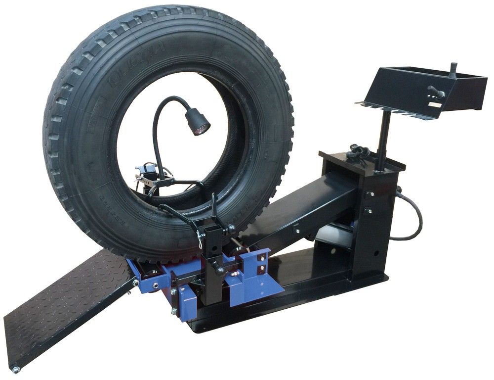 - Широкое основание устройства обеспечивает большую устойчивость, что важно при работе с грузовыми шинами. Источник света на гибкой ножке позволяет тщательно осматривать внутреннюю поверхность шины.