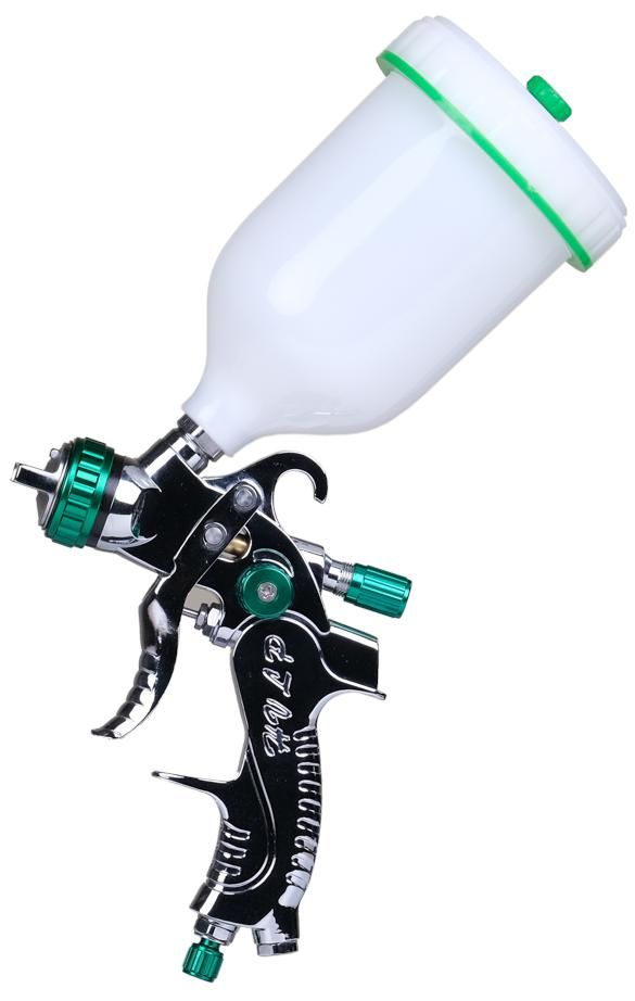 Краскопульты серии HVLP (High Volume Low Pressure) используют технологию высокого расхода воздуха при низком давлении. Эта технология позволяет снизить количество аэрозольного тумана (за счет низкого давления в распыляющей головке, около 0,7 Бар) и соответственно увеличить коэффициент переноса материала по сравнению с обычными краскопультами до 65-70%.