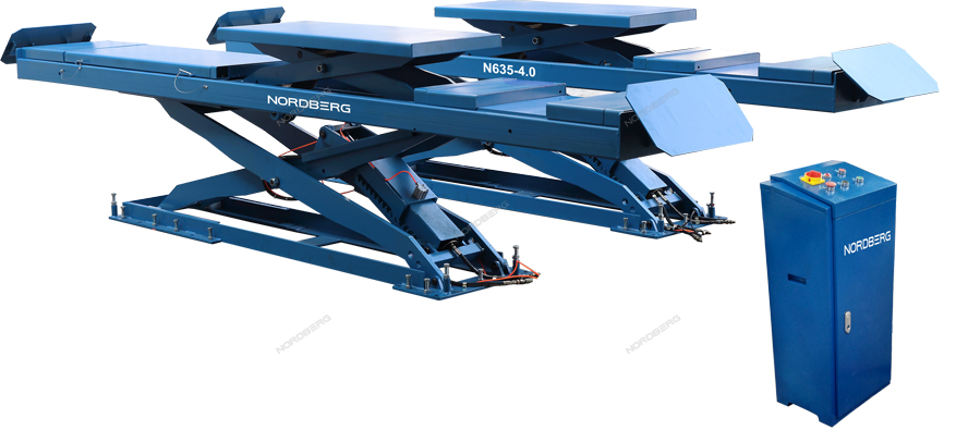 ОписаниеПодъемник ножничный для сход-развала г/п 4 тонны, двойной уровень подъема NORDBERG N635-4,0