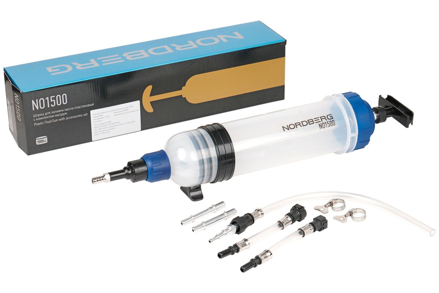 Шприц для заливки масла пластиковый с комплектом насадок, 1500 мл NORDBERG NO1500