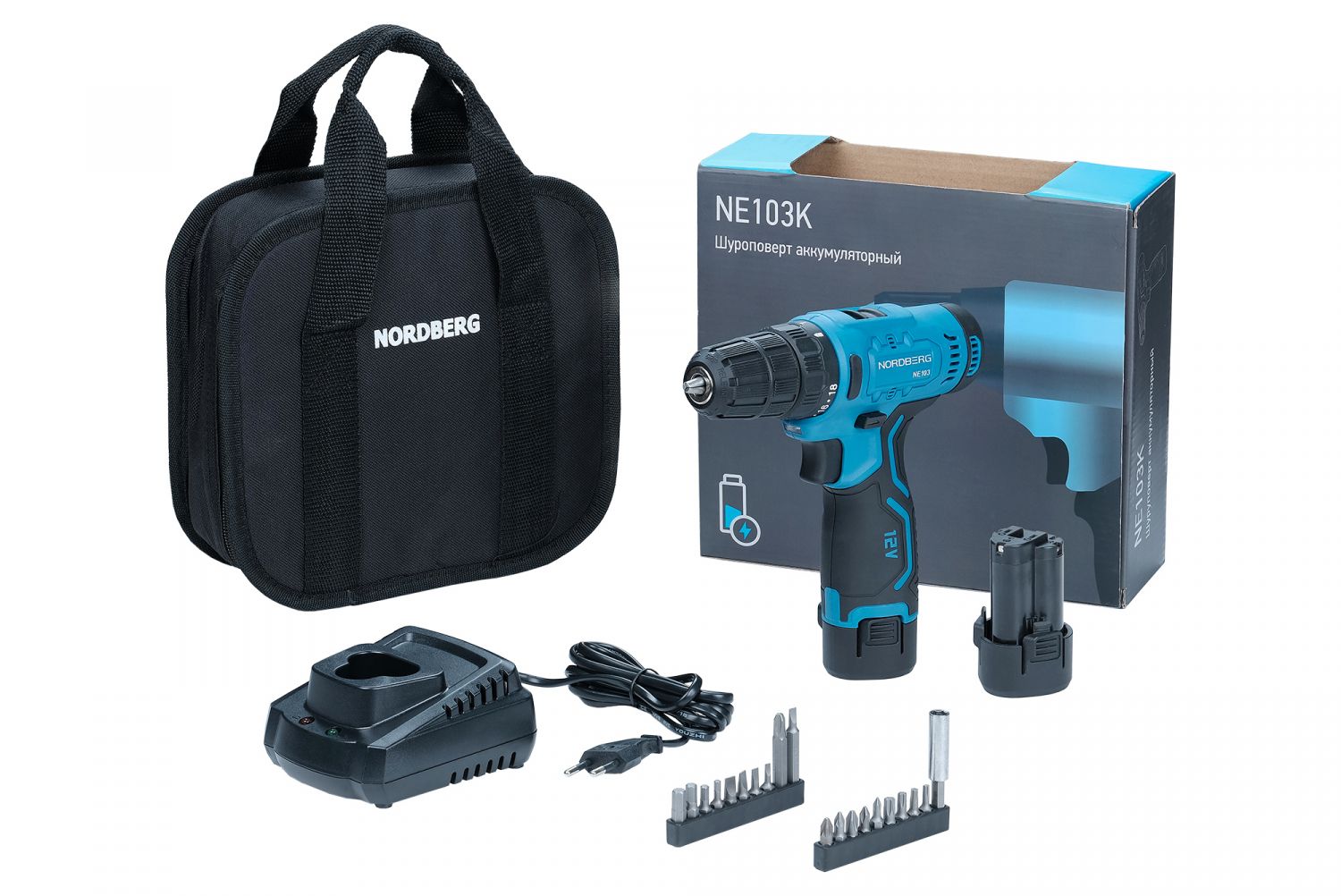 Аккумуляторный шуруповерт NORDBERG NE103K+ NE9012 2 скорости, крутящий момент до 30 Нм. Быстрая замена насадок производится за счет зажимного 10-ти миллиметрового патрона. В комплект включены аккумулятор и зарядное устройств