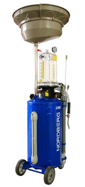 Установка для замены масла NORDBERG 2380-E удаляет отработанное масло и другие жидкости из любого транспортного средства при помощи вентури-вакуумной вытяжной системы.